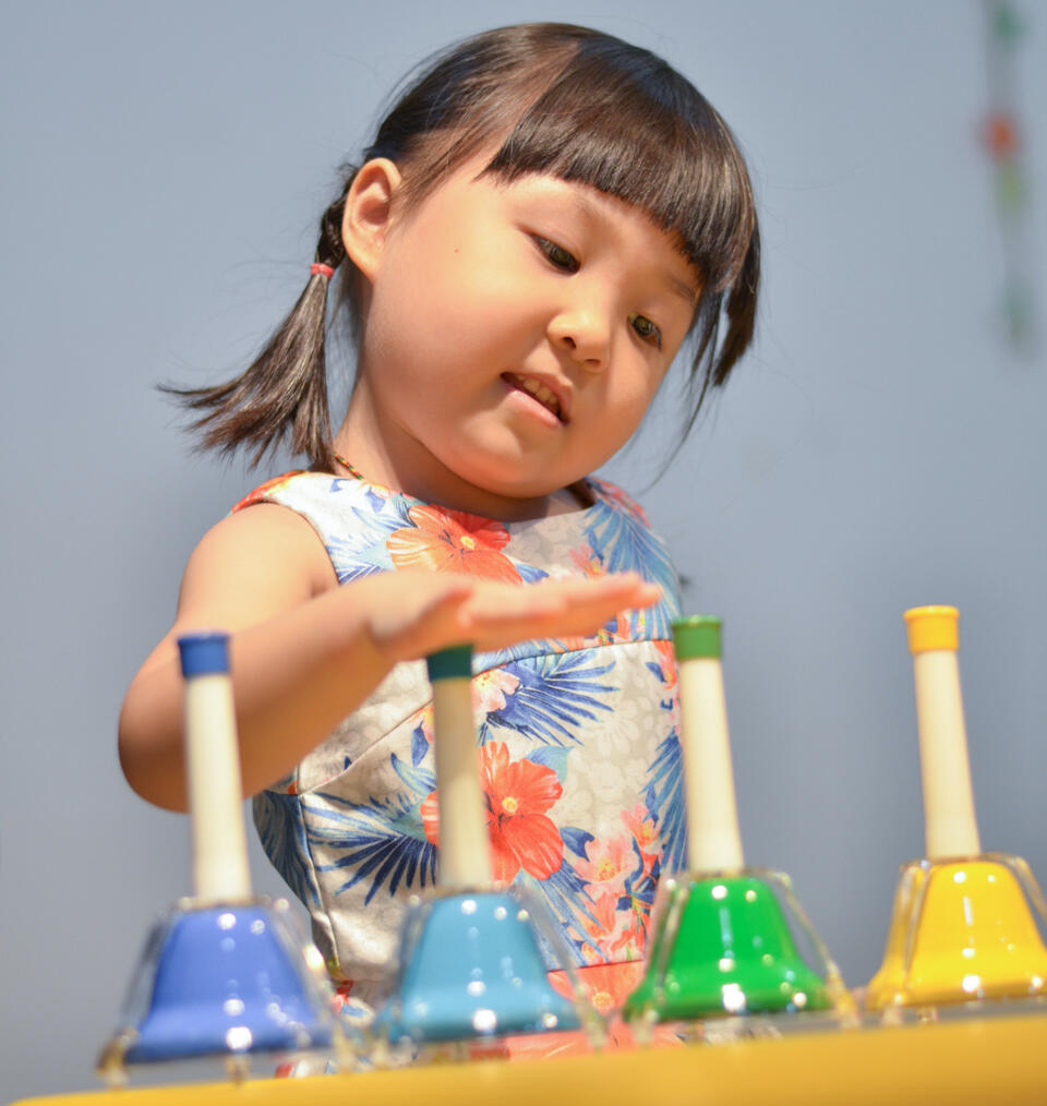 Little Tones uses a set of handbells as the first pitched instrument. Don’t be fooled by the look of it: Playing in a handbell ensemble requires focus, teamwork, listening skills, and a sense of beat, to name a few. Students are trained to stay focused listening to the music and teammates, memorize their notes and wait for their turn to play the bells. The skills acquired in playing a handbell ensemble are fundamental not just in future music studies, but also many aspects of life.Students are also taught to play the resonator bar. Why this instrument? Hitting particular bars precisely trains motor skills and eye-hand coordination. Students are trained to play one bar/note at a time (out of eight) with proper rhythm and tempo. This is not an easy task for 3- to 4-year-old children!As for non-pitched instruments, students get to create various rhythmic patterns and explore the different sounds of wooden sticks, shakers, plastic buckets, etc.From the “colored” method of Levels I & II, students advance to the black-and-white note reading and writing on the grand staff in Levels III & IV. Our students enjoy these note reading and writing drills, too, as our fun and unique hands-on approach helps them retain this knowledge easily! Levels III & IV students also learn to play the keyboard. This combines memory and concentration skills, muscle memory training, confidence boosts and musical abilities -- all in one package.Let every young child shine!